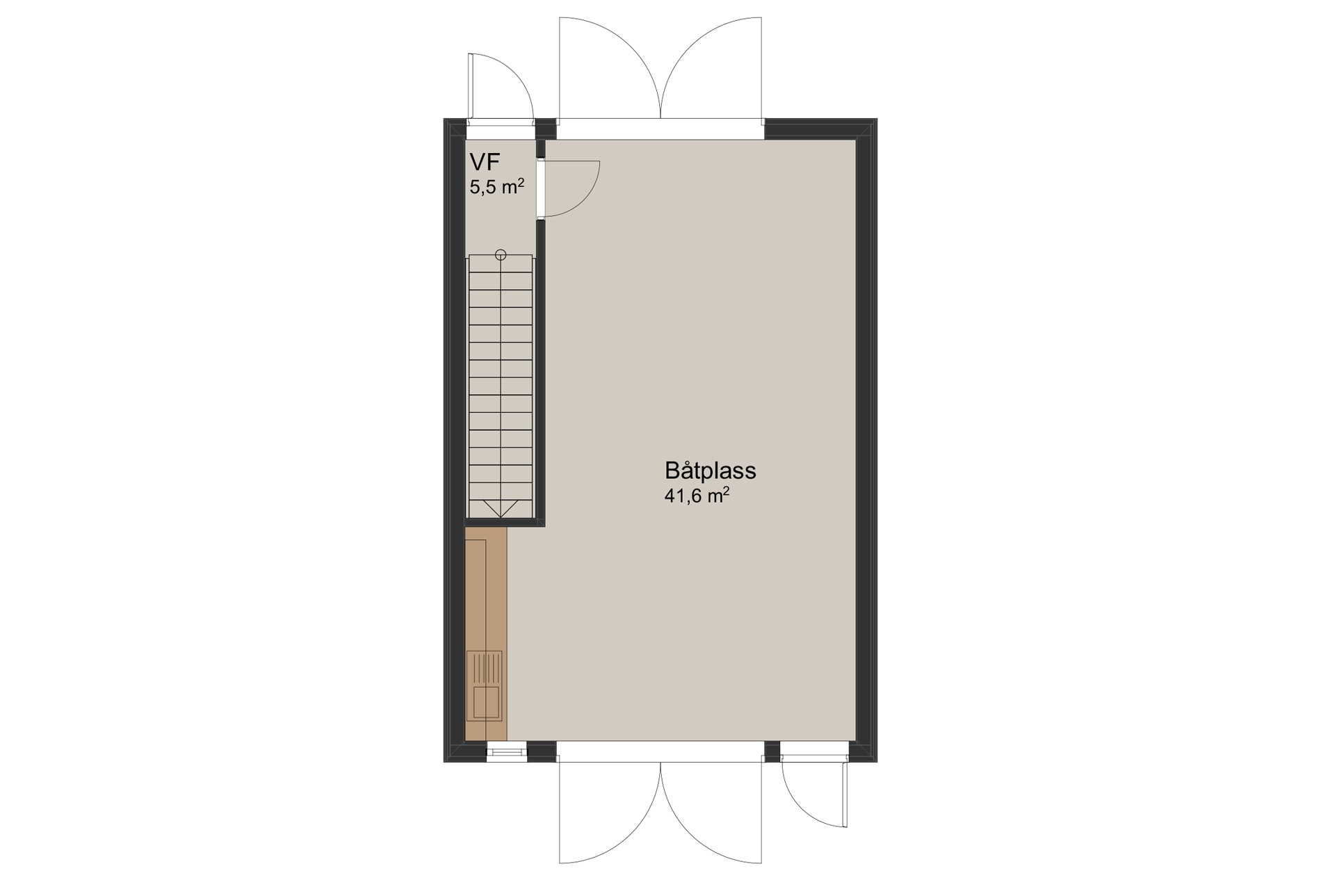 I første etasje finner du et stort rom som er ment for oppbevaring av båt. Brede porter i begge ender av bygget gjør at det er enkelt å få båten ut og inn av rorbuen, og langveggene egner seg godt til oppbevaring av fiskeutstyr og vedlikeholdsprodukter til båten. Du finner også et grovkjøkken for sløying av fisk i denne etasjen, samt adskilt trappeoppgang til oppholds- og soverom i andre etasje.