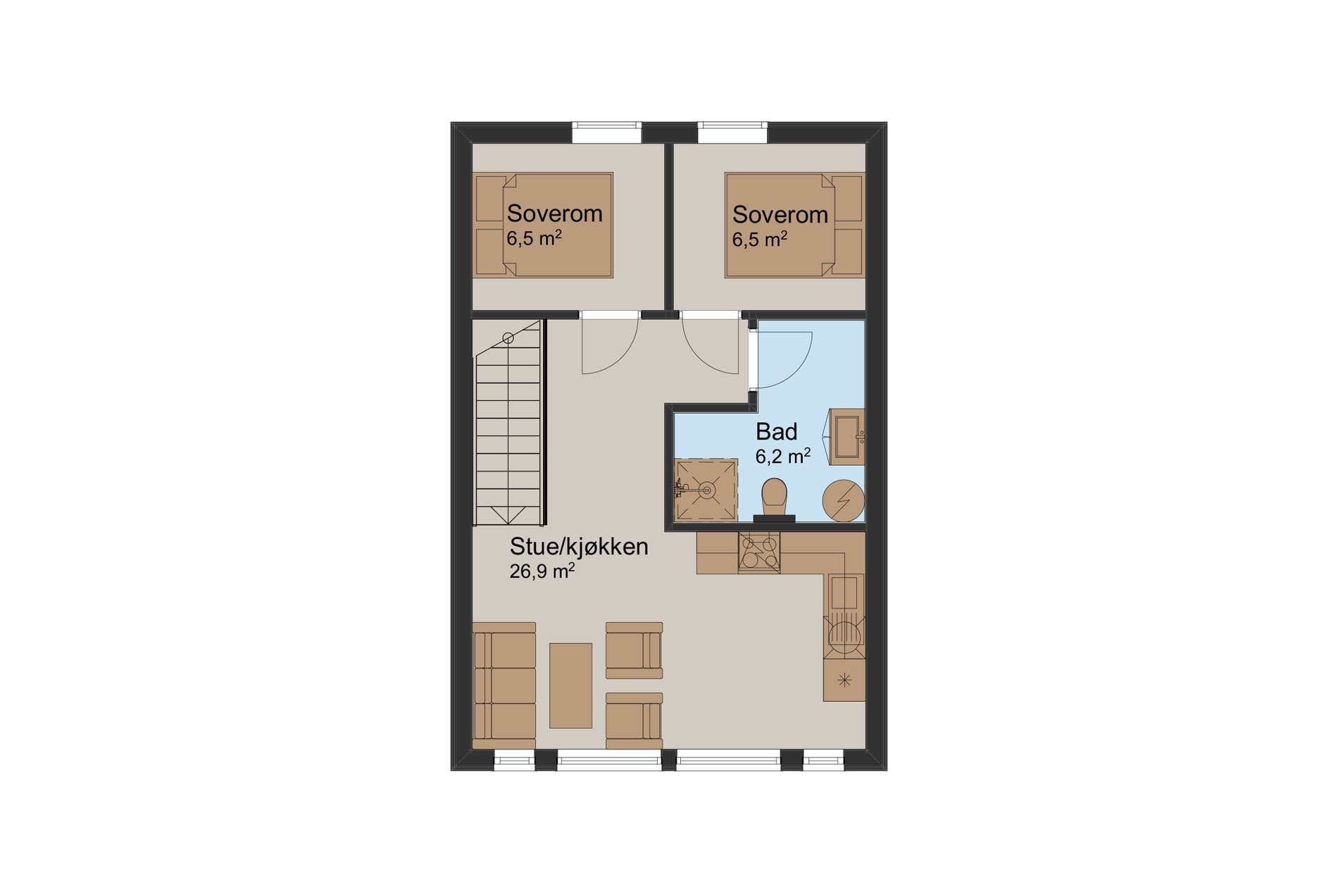 Går du opp trappen kommer du inn i en trivelig stue-/kjøkkenløsning med plass til både sittegruppe og spisebord. Taket er mønt, så det er høyt under taket og lyset fra vinduene gjør dette til et godt opplyst rom hvor man kan nyte utsikten til sjøen utenfor. Fra allrommet har du også tilgang til hyttens to soverom og et romslig bad.