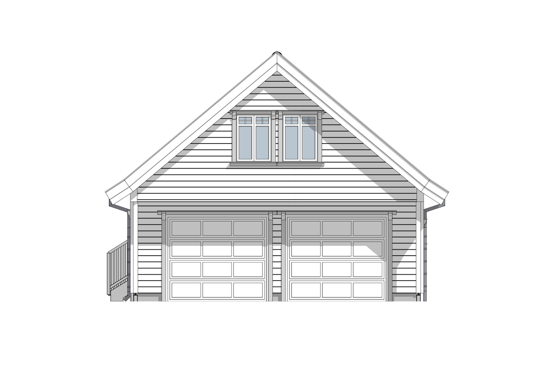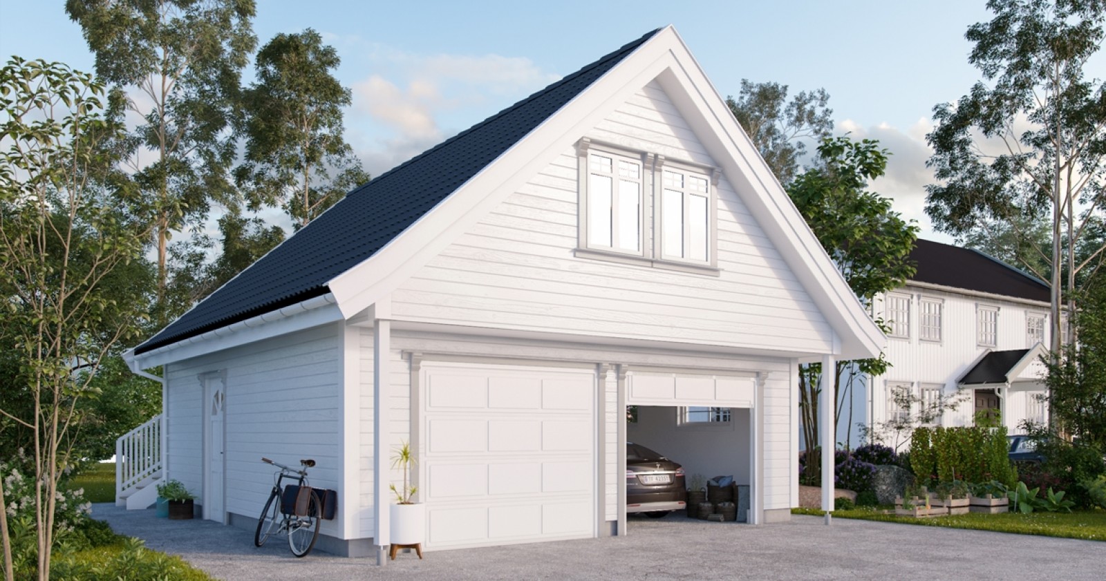 807 er en dobbelgarasje med to etasjer i klassisk stil. Her har du plass til lagring av både biler, sykler, hageredskaper og sportsutstyr. I garasjerommet, som har to porter, får du plass til to personbiler, og en praktisk bod i bakkant lar deg lagre unna julepynt og andre ting som du ikke behøver å lagre i boligen din.