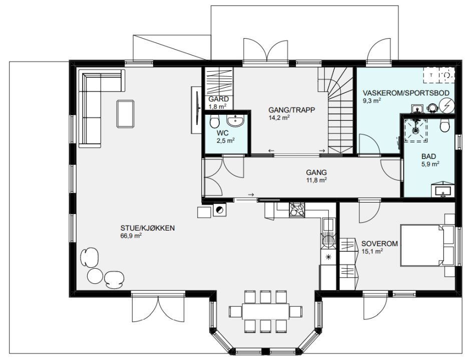 Fra boligens overbygde inngangsparti, kan du ta deg inn i en gang med gode garderobeløsninger. Videre i første etasje finner du et stort soverom, et bad og WC. Det store og praktiske vaskerommet har egen utgang til boligens uteområde, veldig praktisk når man har barn. Første etasjen har i tillegg en sjenerøs åpen stue- og kjøkkenløsning på hele 67m2.