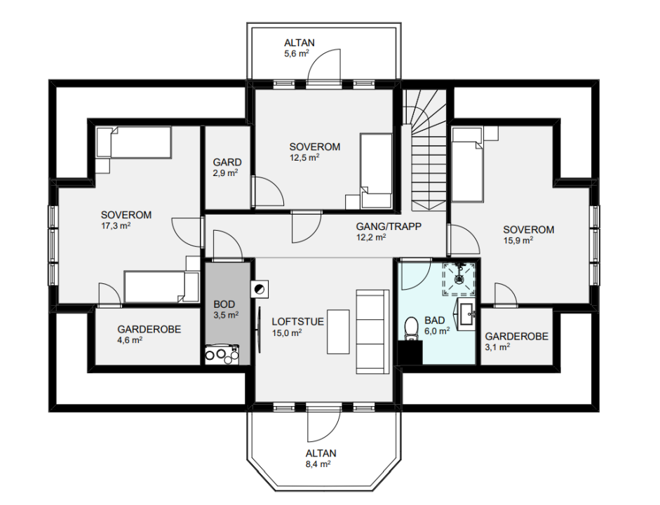 I andre etasje finner du tre soverom, hvor alle har walk-in garderobeløsninger. Boligen har en ekstra TV-stue med utgang til en herlig altan. Videre finner du også et bad og en bod til ekstra oppbevaring.