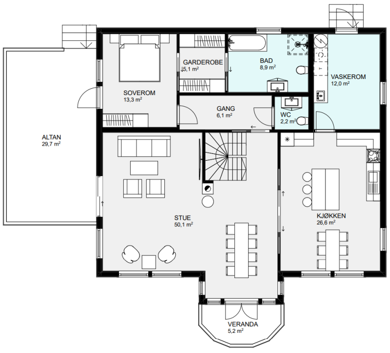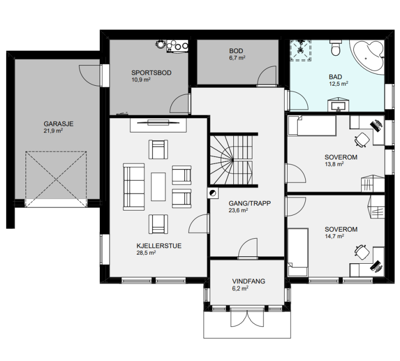 Estoril har også integert garasje og sportsbod i bygningskroppen.